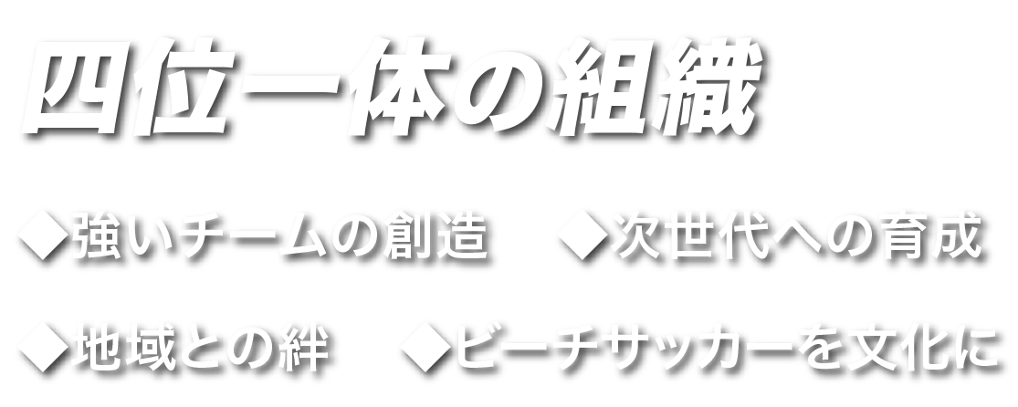 私たちはビーチサッカーを通じて地域との絆を深め「夢」と「感動」を共有し、愛着をもってもらえるチームを目指します。